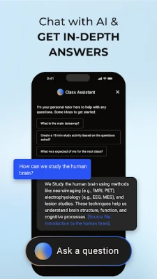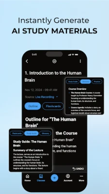 В сърцето на QuickTakes лежат мощни функции, задвижвани от изкуствен интелект. С нашата AI система за водене на бележки можете без усилие да превръщате аудио записи от лекции, PDF документи или дори сканирани материали в ясни и добре структурирани учебни помагала. Задълбочете разбирането си с AI асистента за учене – чатбот, достъпен 24/7, който отговаря на сложни въпроси и разяснява трудни концепции. Утвърдете знанията си с генерирани от изкуствен интелект флаш карти и практически задачи, идеални за преговор преди всеки тест или изпит.